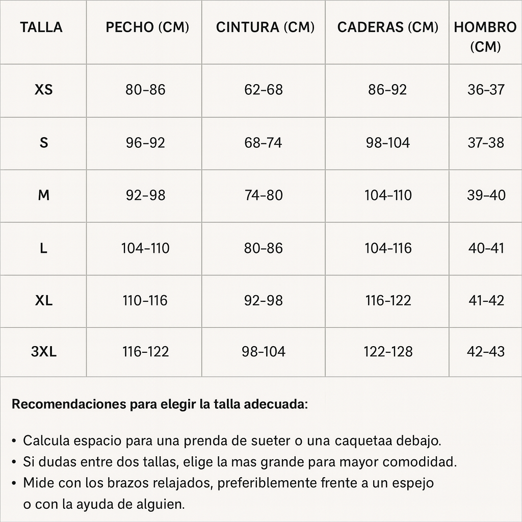 Talla EU Pecho Cintura Cadera Hombros