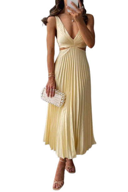 Elévate tu estilo con el vestido Laia. Abraza la elegancia y la sofisticación con el vestido Gala. Con un favorecedor escote en v y una falda plisada, este vestido satinado está diseñado para que destaques en cualquier evento. Captura todas las miradas con el vestido Gala. El elegante detalle de cintura recortada y el hermoso diseño plisado crean un look sofisticado perfecto para cualquier ocasión.